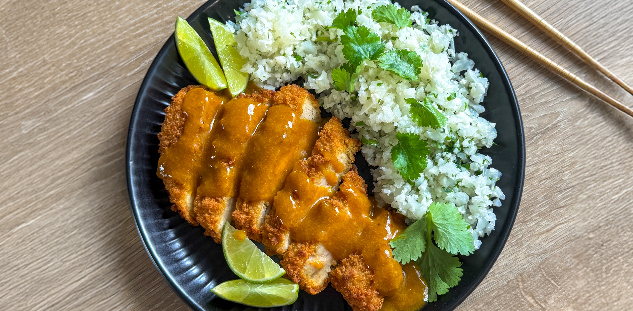 Slice the crispy chicken and serve over rice, spooning the warm katsu sauce on top.