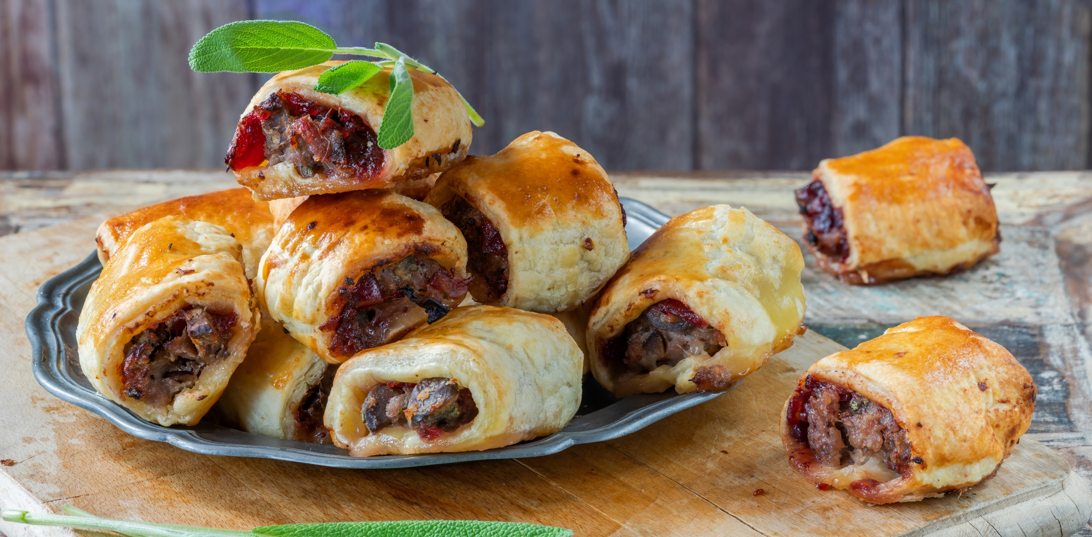 Brush the egg wash along the bottom of the puff pastry with a pastry brush. Bring the pastry around the meat and seal the edges with a fork, then cut into eight rolls.