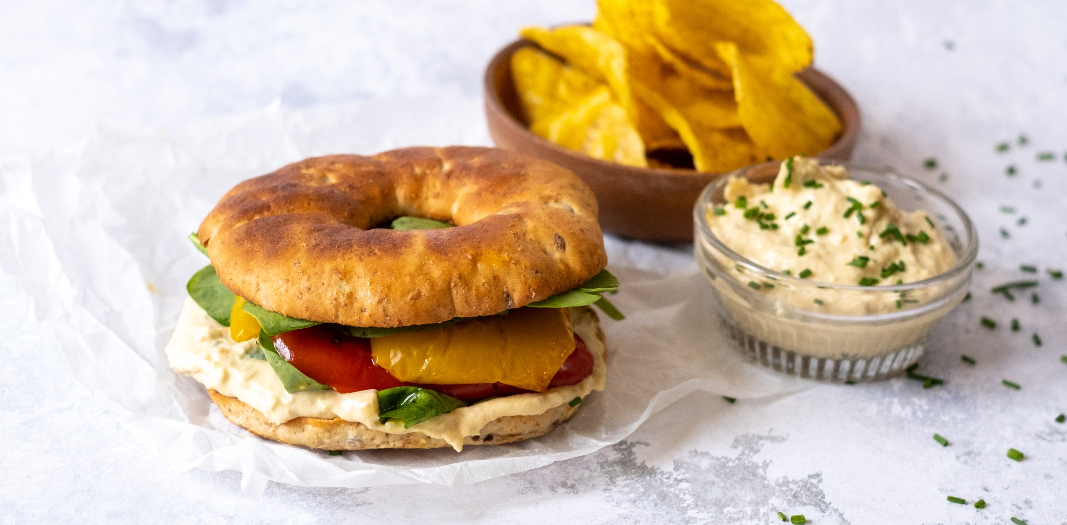 Place bottom half of bagel split side up in bottom ring of Breakfast Sandwich Maker, top with spinach and char-grilled vegetables.